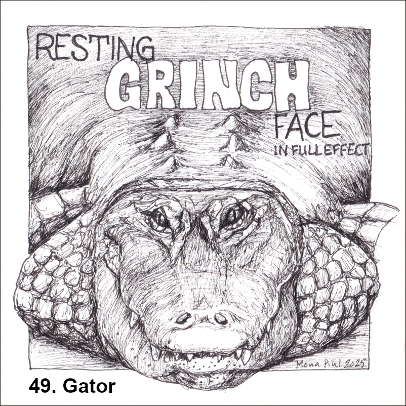 | 7. Grinch face - is an ink drawing that I did for the Inktober52 GATOR challenge, but it also inspired me to add a quote from Sarcastic Lettering Challenge, it is the size of a post-it |