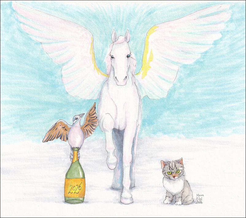 | 1. Challenges - new year and new challenges. We are going into the year of the horse. This is a combination of prompts from ArtistryInkChallenge, Birbfest, 12DaysOfRicky, DrawAndTell & Wetcanvas WDE. |