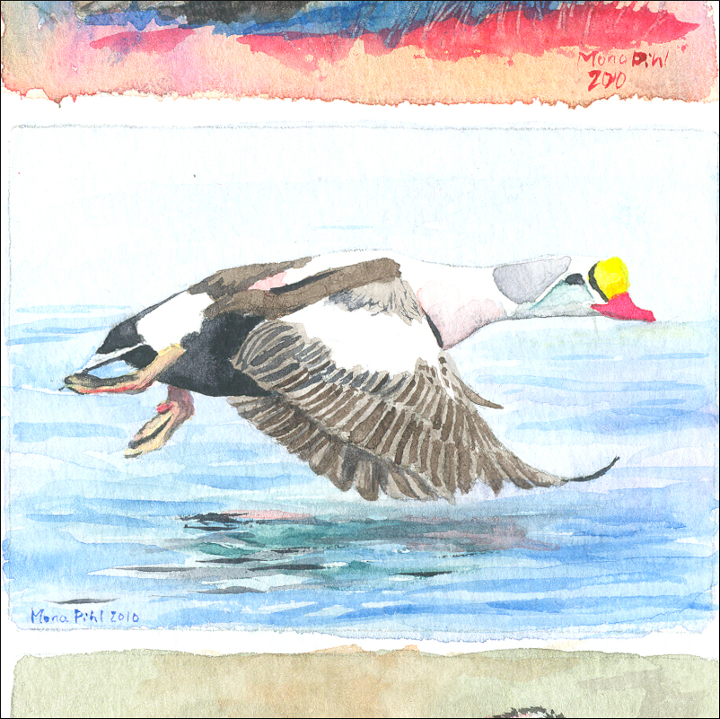 | 5. King Eider - this is a throwback to 2010 when I painted birds found in Sweden on ATC size cards in watercolour using only primary colours for a trade at Wetcanvas. It fits with todays bird in Birbfest. |
