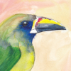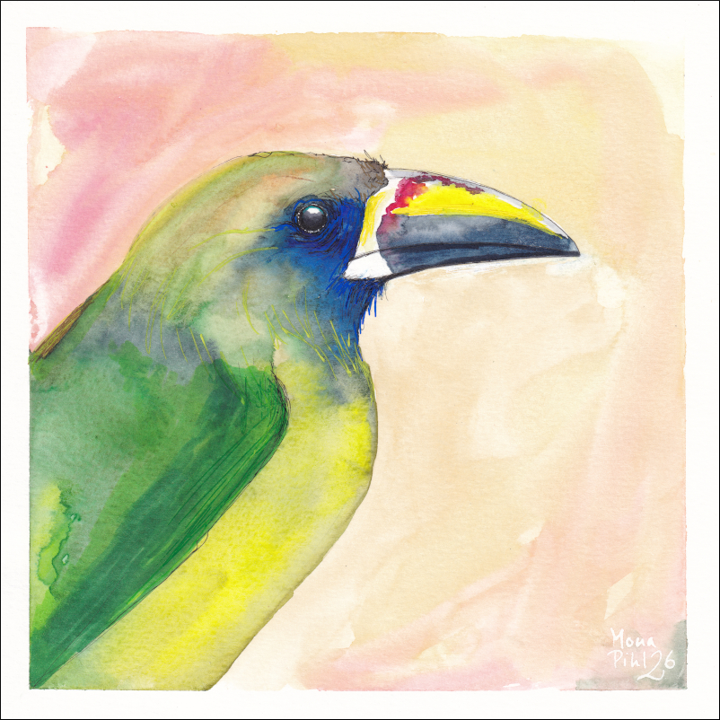 | 6. Northern emerald toucanet - is todays bird in Birbfest. This is a quick watercolour on 19x19 cm hot pressed paper and afterwards I added; ink, copic markers and Pentel Mattehop pencils, I need to experiment more with this. |