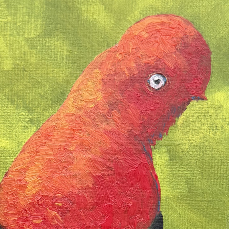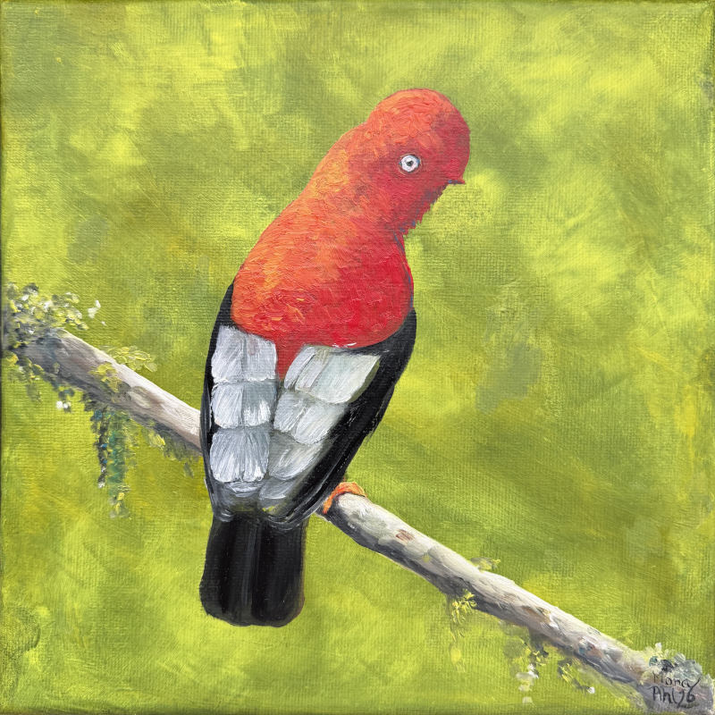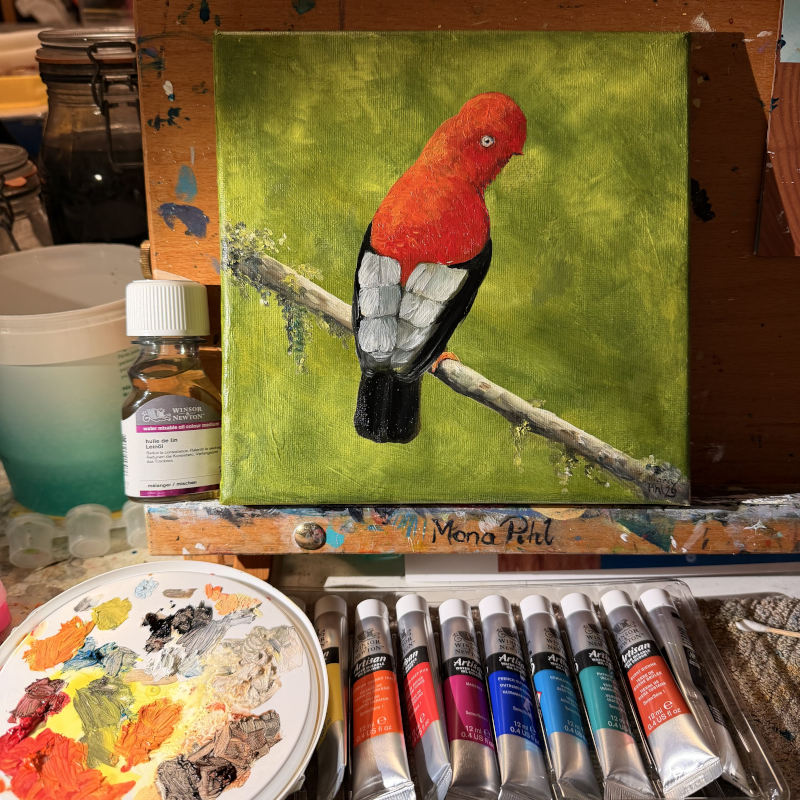 | 8. Andean Cock-of-the-rock - this funny looking bird made me try something that I haven't tried since I was a child and painted with my stepfather's art supplies - OILS!!!!! I decided to try the Artisan water mixable oils that I bought maybe18 months ago, I used a 20x20 cm canvas that was covered in an acrylic basecoat. I loved the possibility to fiddle around with the paint for so much longer than acrylics and make smoth transitions when I wanted to. Now let's se if I love the time it will take to dry (6-12 months), if it will stay the same and if I will have to varnish it.... |