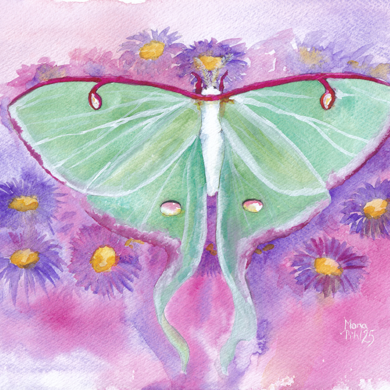 27. Lunar moth on asters - some moths are really beautiful. This is a A4 ink and watercolour/gouache painting. |