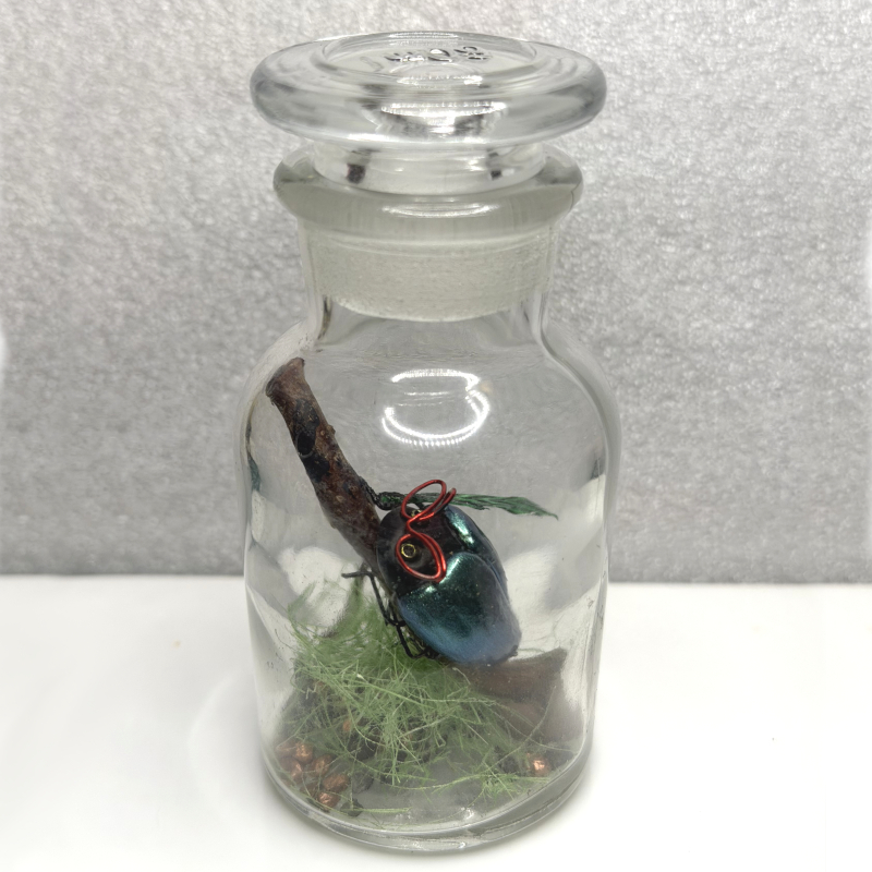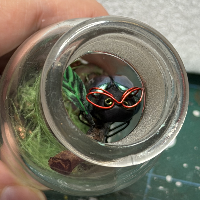 This is an old craft that I just recently renovated. In the "Goblet of Fire", Hermione figures out that Rita Skeeter gets much of her information by using her Animagus skills to transform into a beetle and spy on people. Hermione traps her in a jar and makes her promise to better her ways. The beetle is made of clay and wire, wings were painted using nailpolish and the eyes were made of beads. |